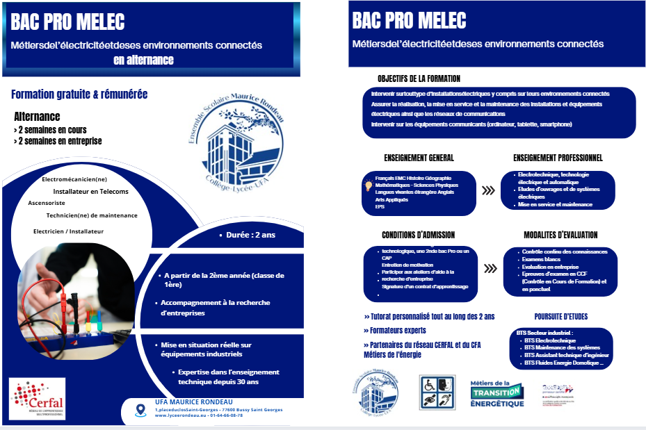 - 2ème année : environ 675 heures de formation (Tale pro MELEC)